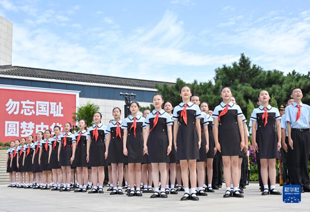 7月7日,首都學生代表在紀念全民族抗戰爆發86周年儀式上朗誦抗戰詩文。