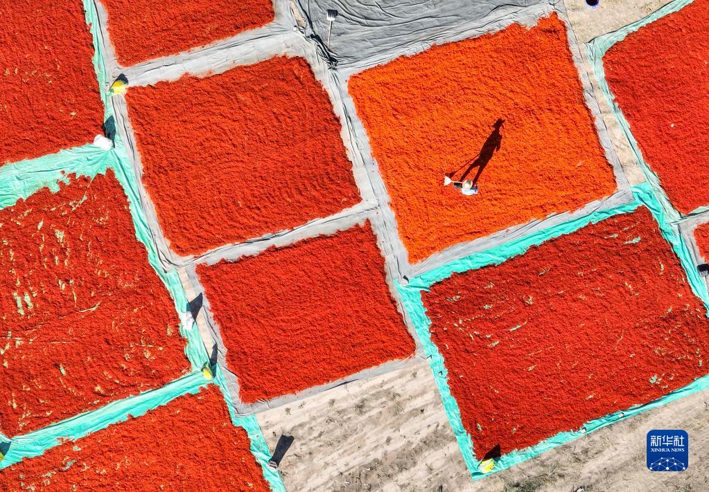 7月7日,新疆裕民縣江格斯鄉(xiāng)的村民在晾曬紅花絲(無人機照片)。