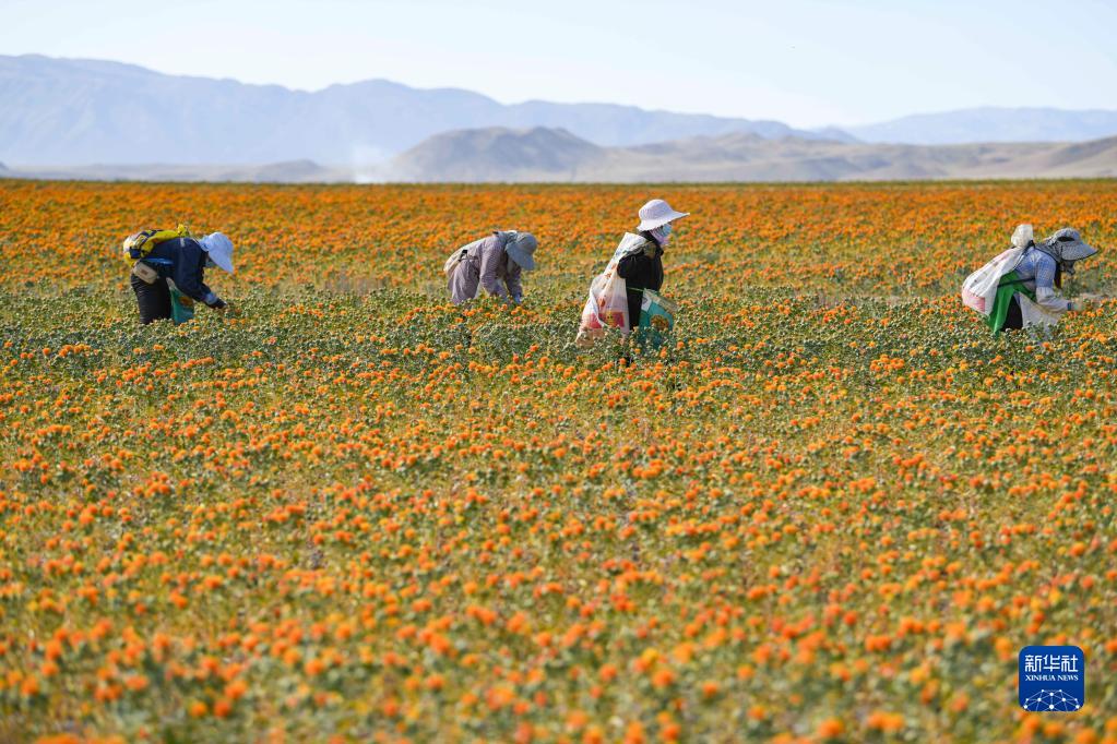 7月7日,采摘工人在新疆裕民縣江格斯鄉的紅花地忙碌。
