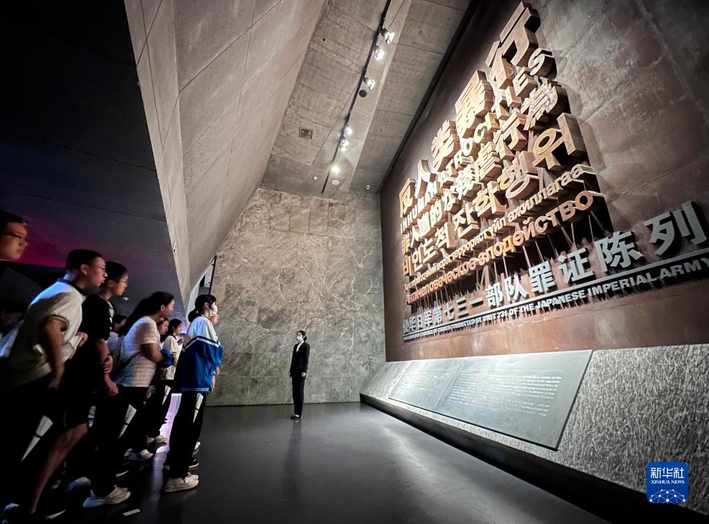7月7日,在侵華日軍第七三一部隊罪證陳列館,參觀者參觀用六種語言寫的“反人類暴行”墻。