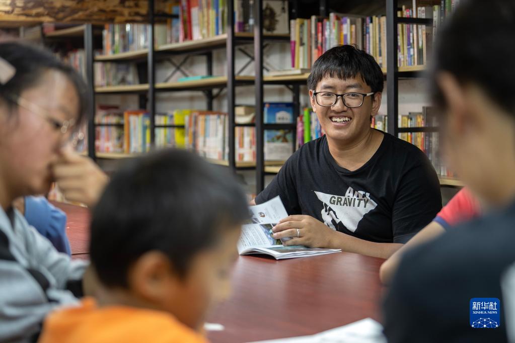 7月5日晚,甘文勇(左三)在“半山花語”書屋組織讀書活動。新華社記者 費茂華 攝