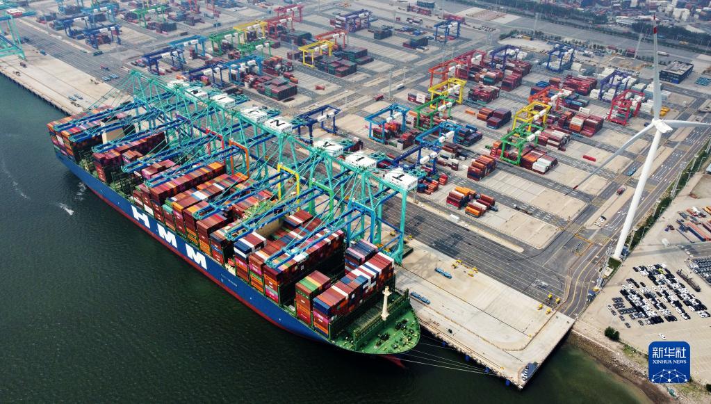 7月7日,一艘貨輪停靠在天津港“智慧零碳”碼頭(無人機照片)。