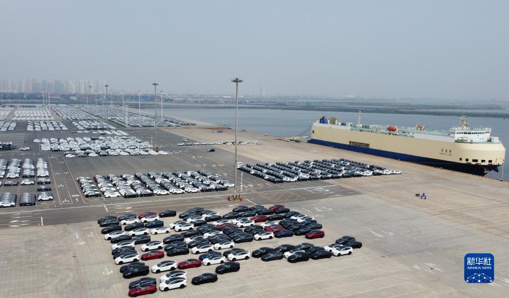 7月7日,一艘滾裝船停靠在天津港環球滾裝碼頭(無人機照片)。