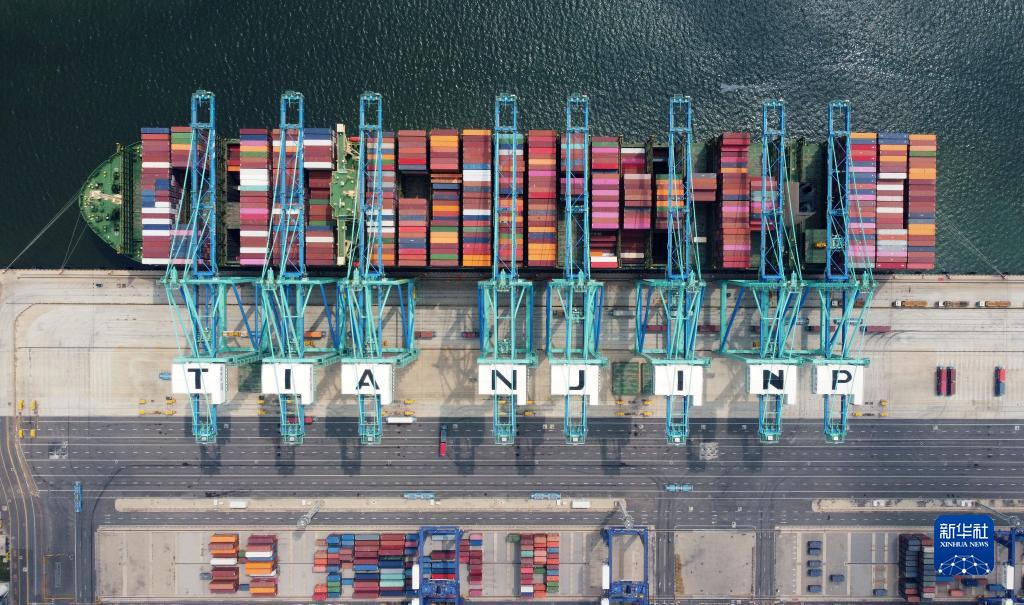 7月7日,一艘貨輪停靠在天津港“智慧零碳”碼頭(無人機照片)。