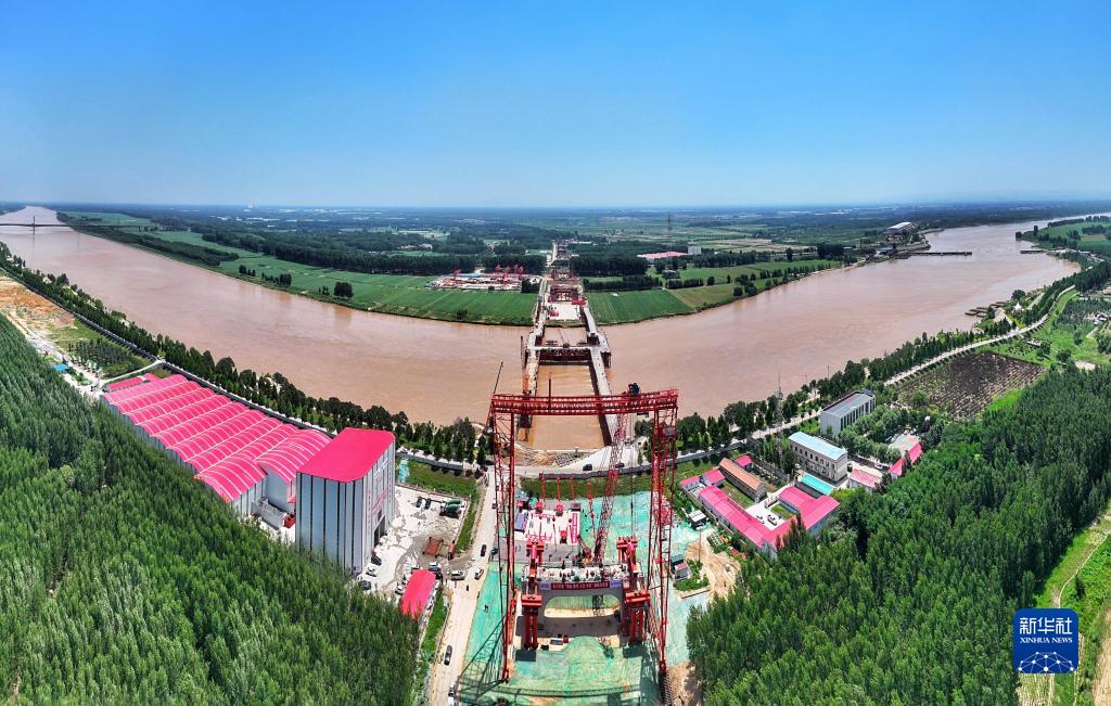 7月7日,在濟濱高鐵濟陽黃河公鐵兩用特大橋建設現場,中鐵大橋局的施工人員在架設鋼桁梁(無人機照片)。