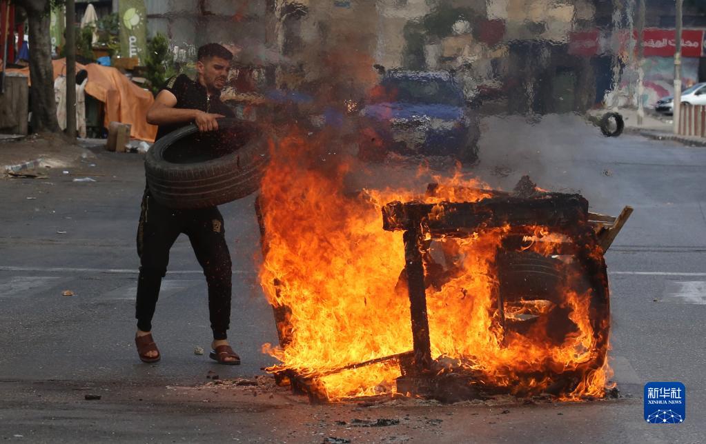 7月7日,一名抗議者在約旦河西岸城市納布盧斯焚燒輪胎。