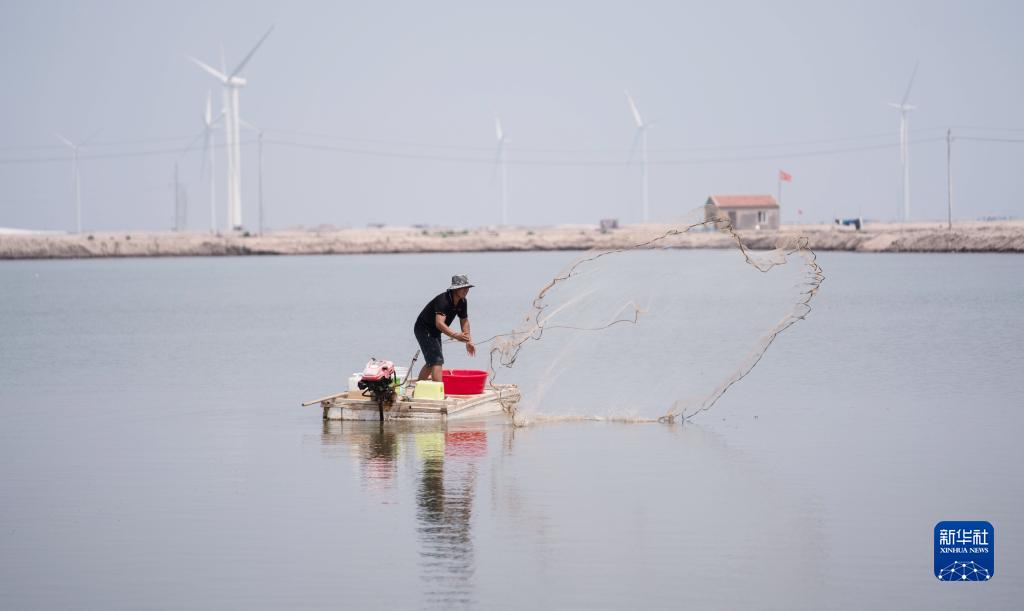 7月7日,在滄州渤海新區(qū)黃驊市一家養(yǎng)殖專業(yè)合作社蝦塘,工人在打撈對(duì)蝦。