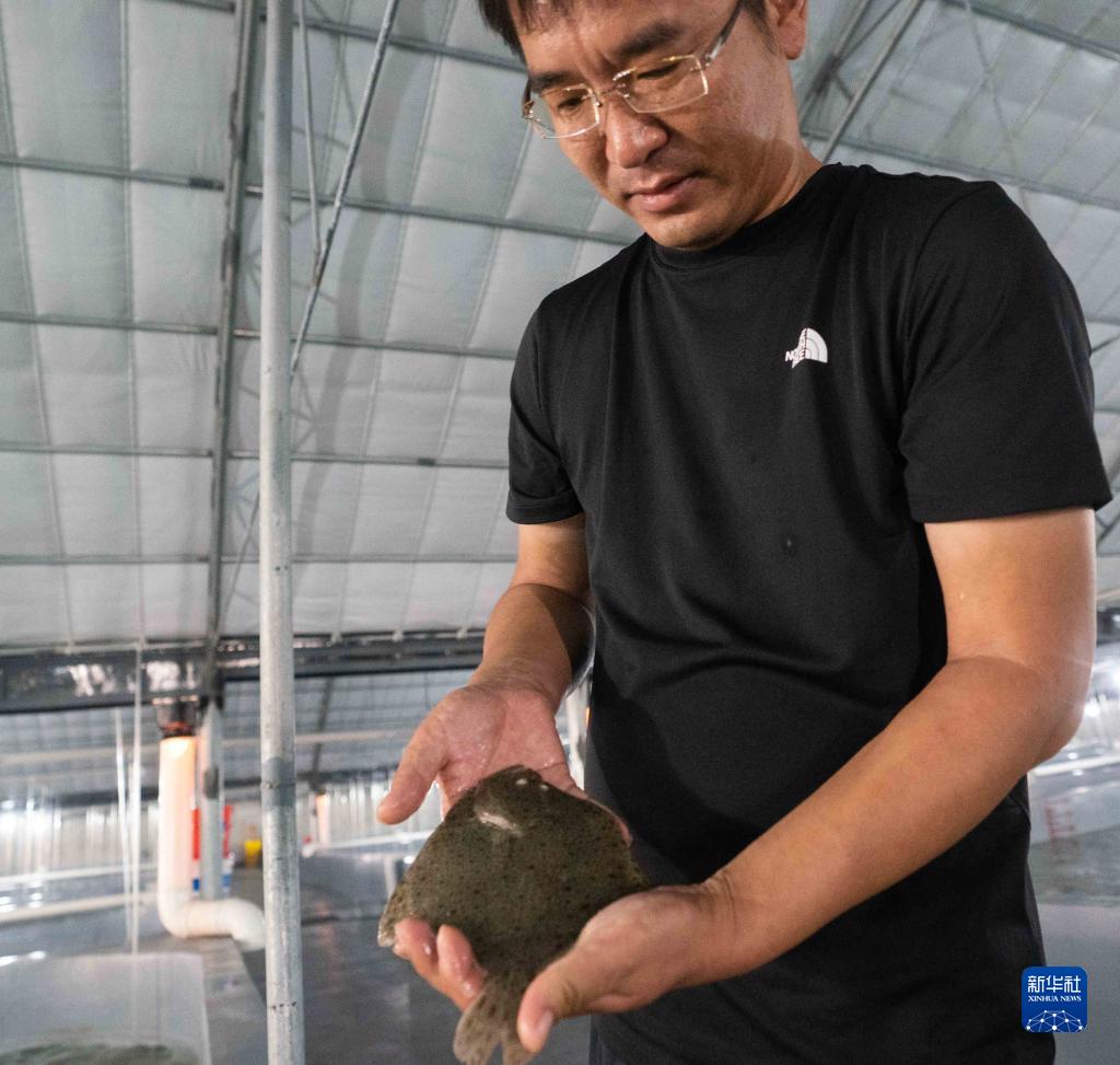 7月7日,在滄州渤海新區(qū)黃驊市一家水產(chǎn)養(yǎng)殖有限公司養(yǎng)殖車間,工人在查看多寶魚生長(zhǎng)情況。
