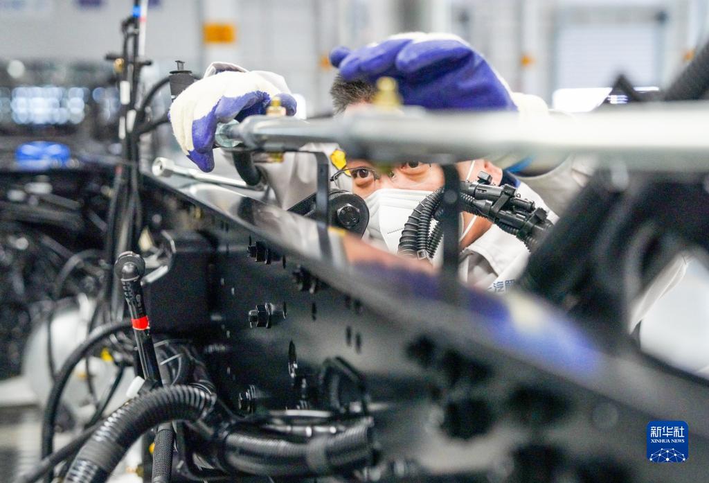 在位于吉林長春的一汽解放J7智能工廠內,車間主任王一強在生產線上檢查汽車零部件(2022年12月27日攝)。