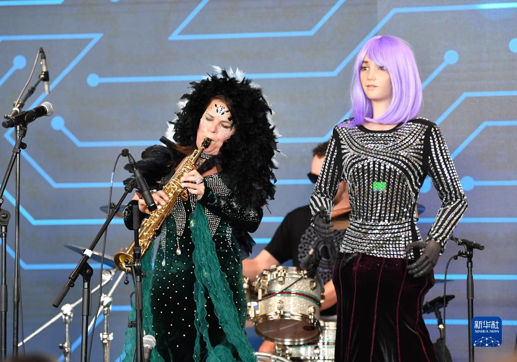 7月7日,在瑞士日內(nèi)瓦“人工智能造福人類全球峰會(huì)”上,仿真機(jī)器人德斯迪莫納與樂隊(duì)一起在舞臺(tái)上演出。