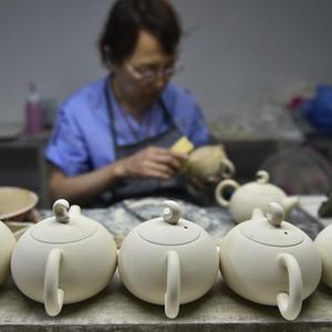 7月7日,工作人員在河南省汝州市玉松汝瓷有限公司的車間里制作汝瓷產(chǎn)品。