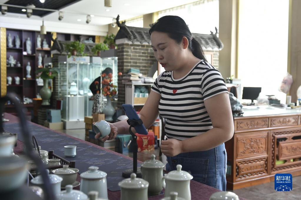 7月7日,工作人員在位于汝州市的河南弘寶汝瓷坊有限公司的展廳里通過手機直播進行銷售。