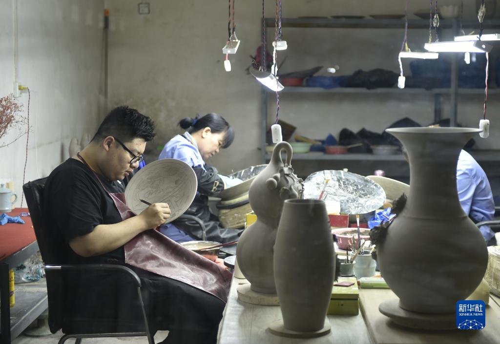 7月6日,工作人員在河南省汝州市玉松汝瓷有限公司的車間里制作汝瓷產品。