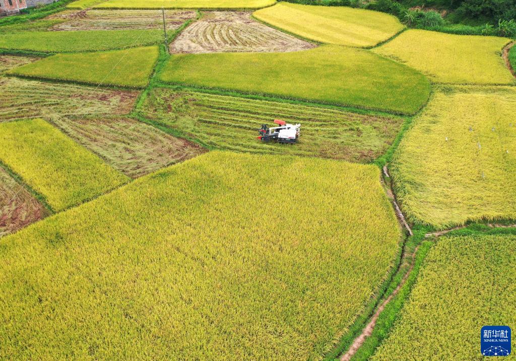 一臺收割機在南寧市橫州市新福鎮(zhèn)搶收早稻(7月7日攝,無人機照片)。