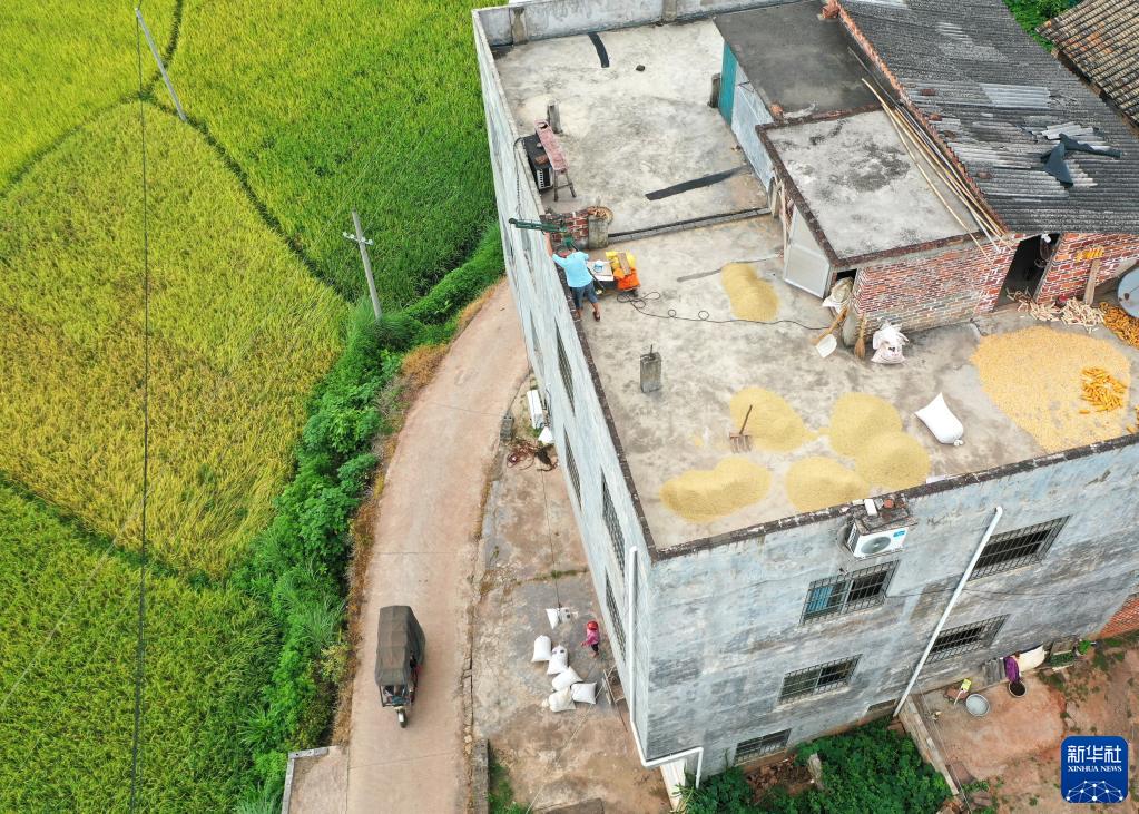 南寧市橫州市新福鎮農民將剛剛收割的早稻吊上屋頂,準備晾曬(7月7日攝,無人機照片)。