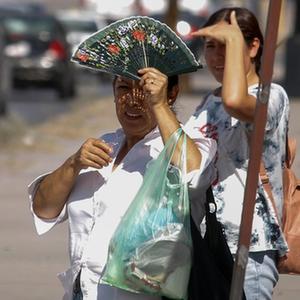 7月7日,一名女子拿著扇子站在墨西哥華雷斯城街頭。