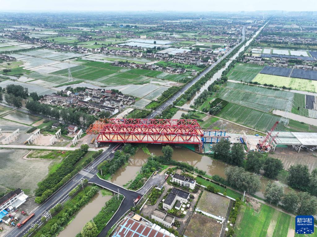 7月8日拍攝的常泰長江大橋南北公路接線工程跨G345特大橋鋼桁梁頂推作業現場(無人機照片)。