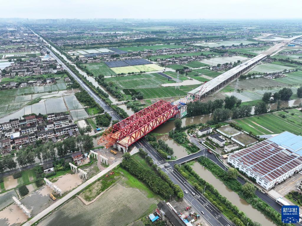 7月8日拍攝的常泰長江大橋南北公路接線工程跨G345特大橋鋼桁梁頂推作業現場(無人機照片)。
