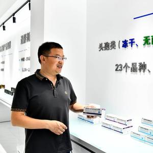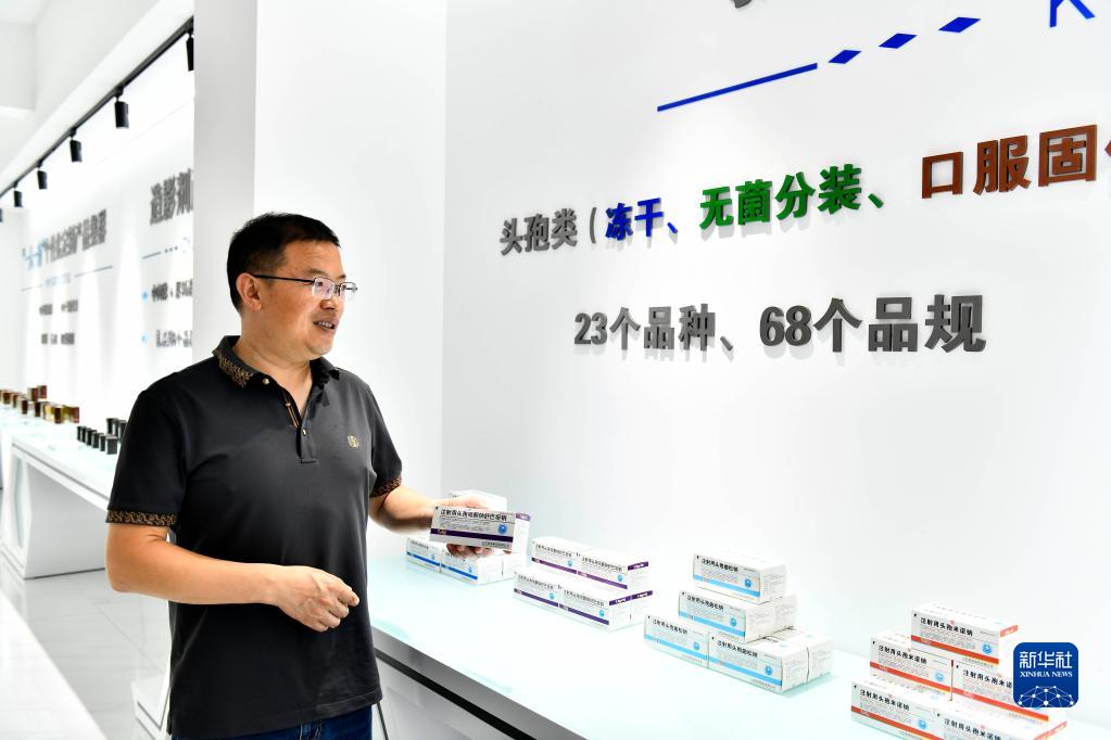 7月7日,在菏澤了未元生物醫(yī)藥大健康產業(yè)園展廳,工作人員介紹產業(yè)園醫(yī)藥產品生產情況。