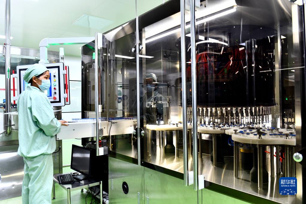 7月7日,在菏澤了未元生物醫藥大健康產業園,工作人員在注射用頭孢呋辛鈉生產線值守。
