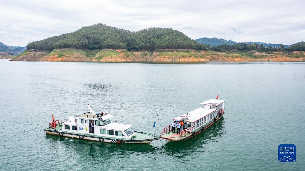 貴州省興義市交通運(yùn)輸海事中隊(duì)的工作人員在對(duì)萬(wàn)峰湖上的游船進(jìn)行臨停巡檢(7月5日攝,無(wú)人機(jī)照片)。