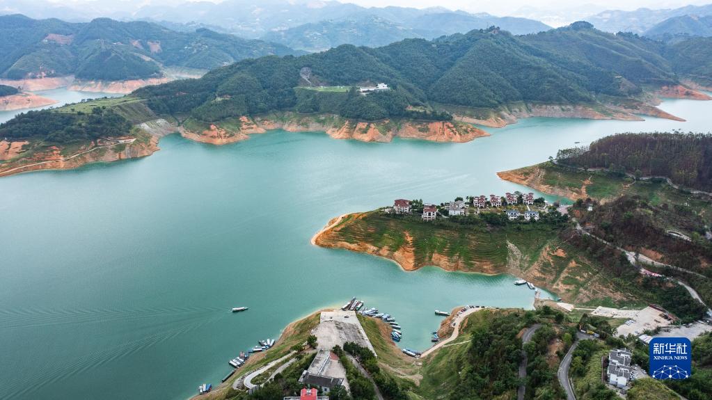 船只行駛在萬峰湖南盤江鎮水域(7月4日攝,無人機照片)。