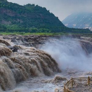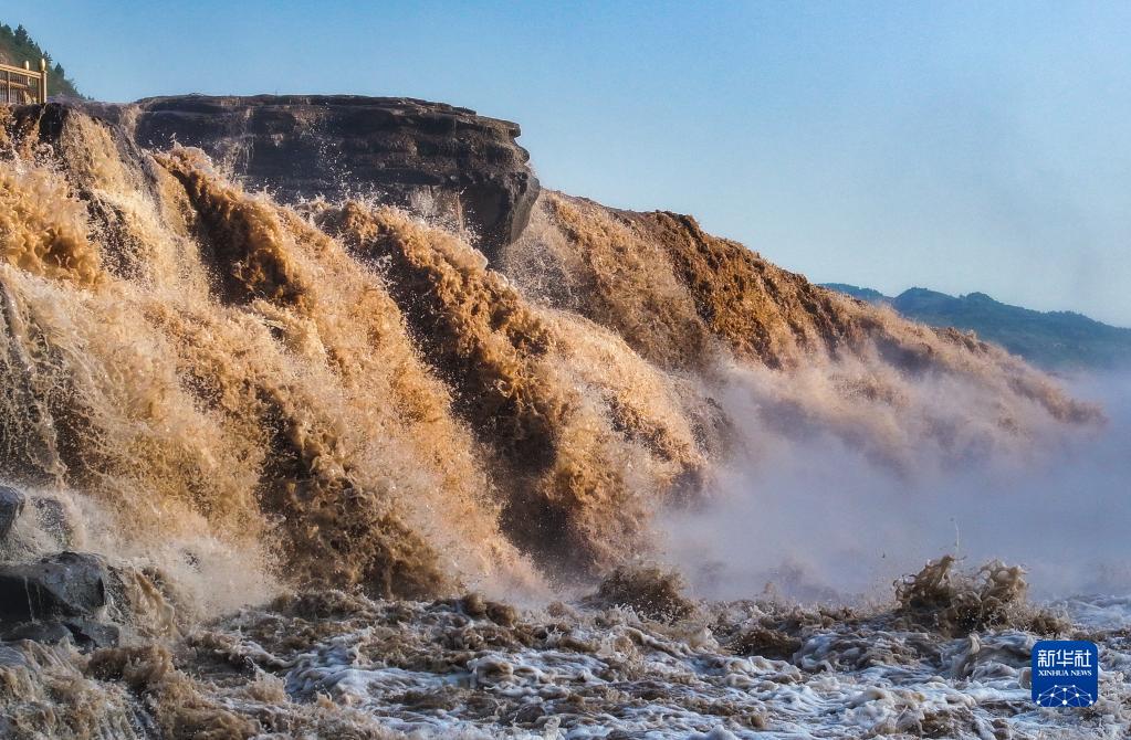 近日,黃河壺口瀑布水流量增大,水勢洶涌澎湃,蔚為壯觀。