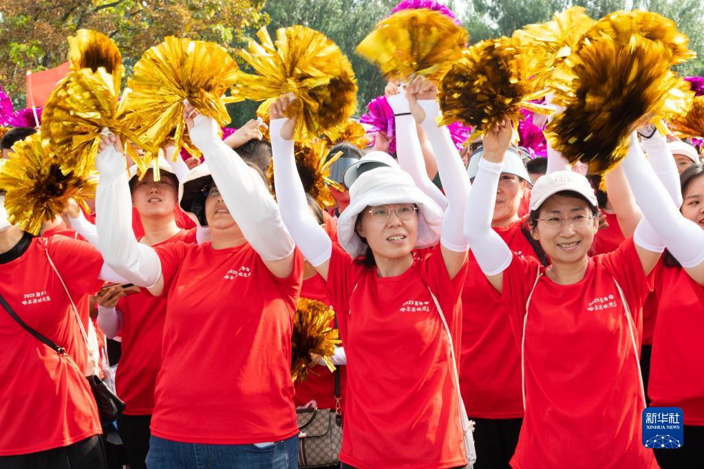 7月8日,在哈爾濱市太陽島景區(qū)太陽石廣場(chǎng),人們慶祝哈爾濱市獲得2025年第九屆亞洲冬季運(yùn)動(dòng)會(huì)舉辦權(quán)。