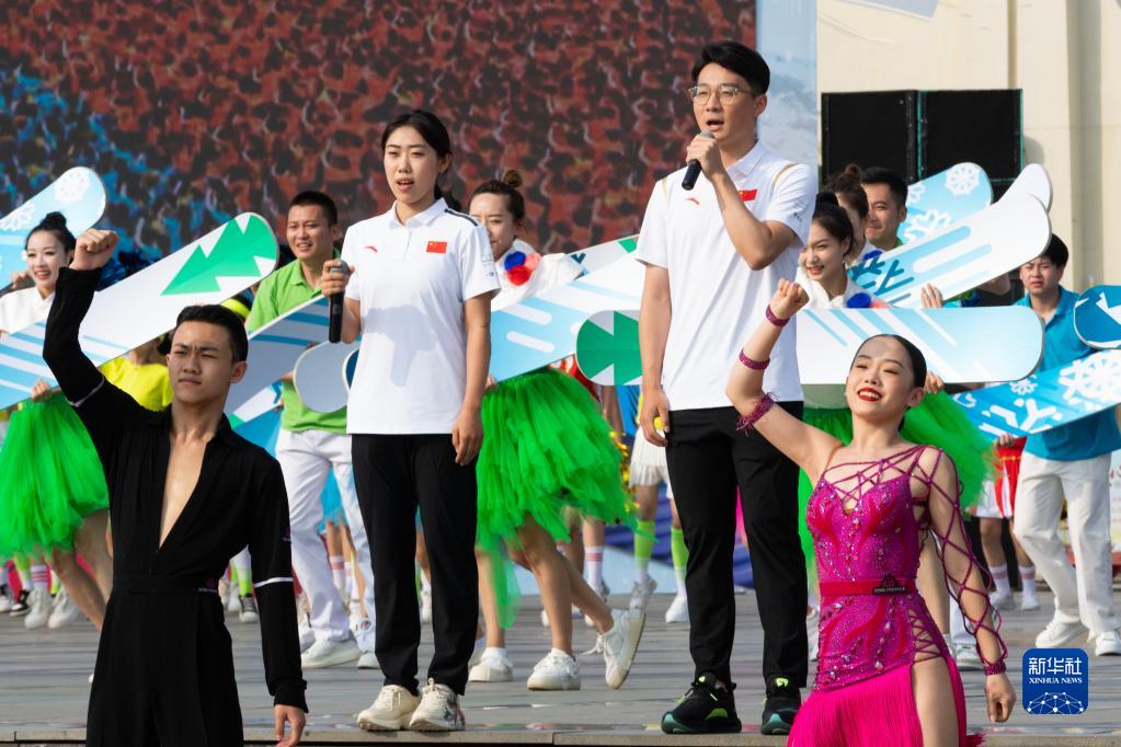 7月8日,在哈爾濱市太陽島景區太陽石廣場,奧運冠軍任子威(右)和張雨婷在慶祝儀式上演唱歌曲。
