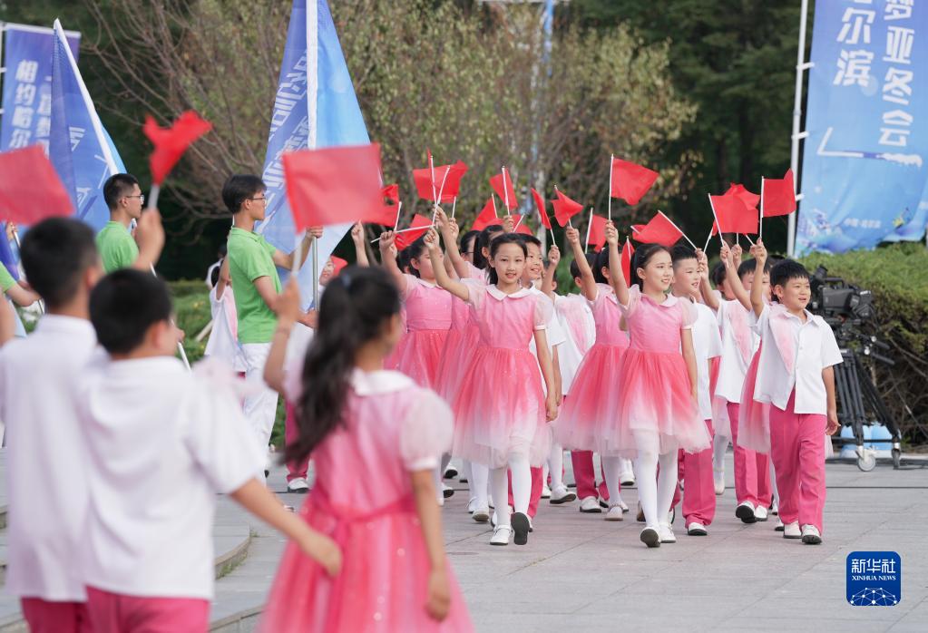 7月8日,在哈爾濱市太陽島景區太陽石廣場,演職人員慶祝哈爾濱市獲得2025年第九屆亞洲冬季運動會舉辦權。