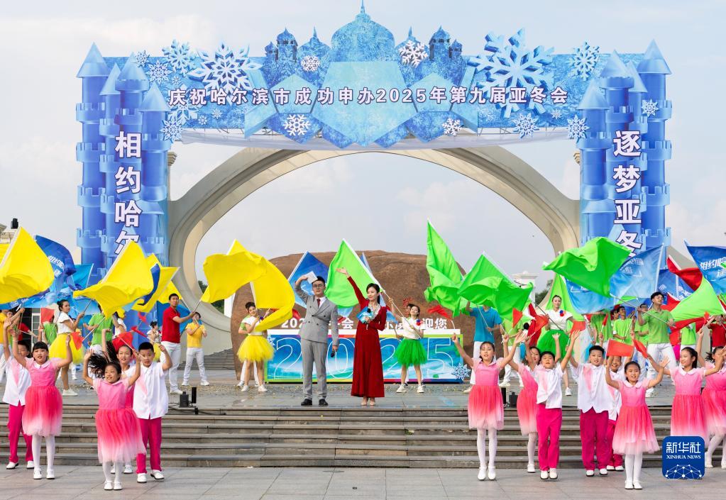 7月8日,在哈爾濱市太陽島景區太陽石廣場,人們慶祝哈爾濱市獲得2025年第九屆亞洲冬季運動會舉辦權。