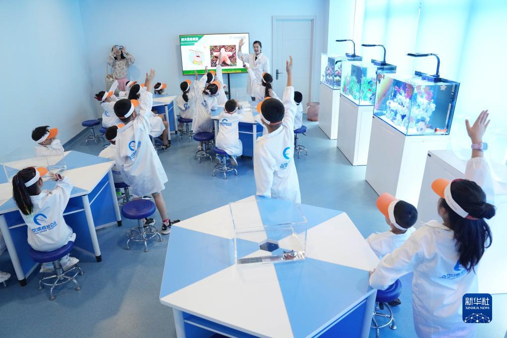 7月8日,在“淘學企鵝館”的海洋實驗室,工作人員在給孩子們介紹海洋知識。