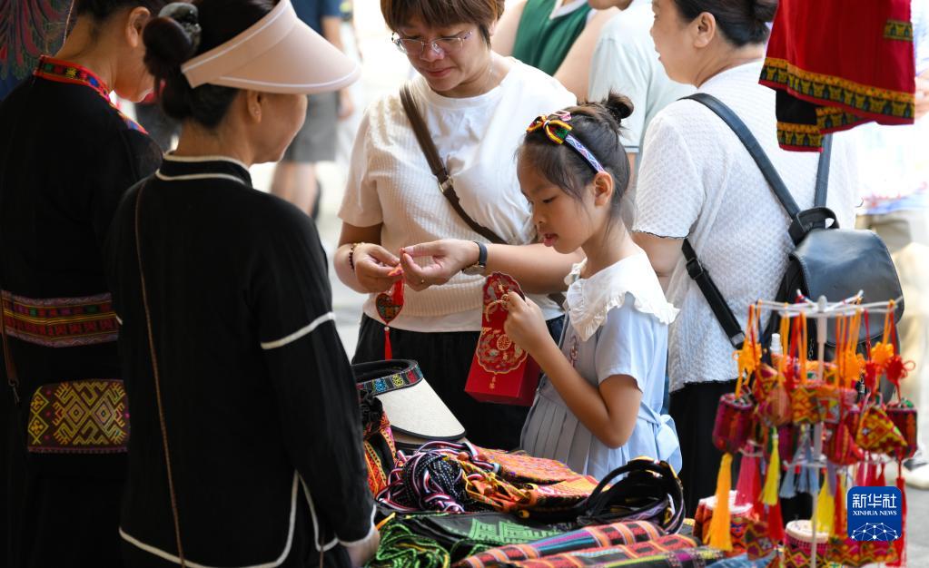 7月8日,游客在五指山三月三廣場選購黎族特色產(chǎn)品。