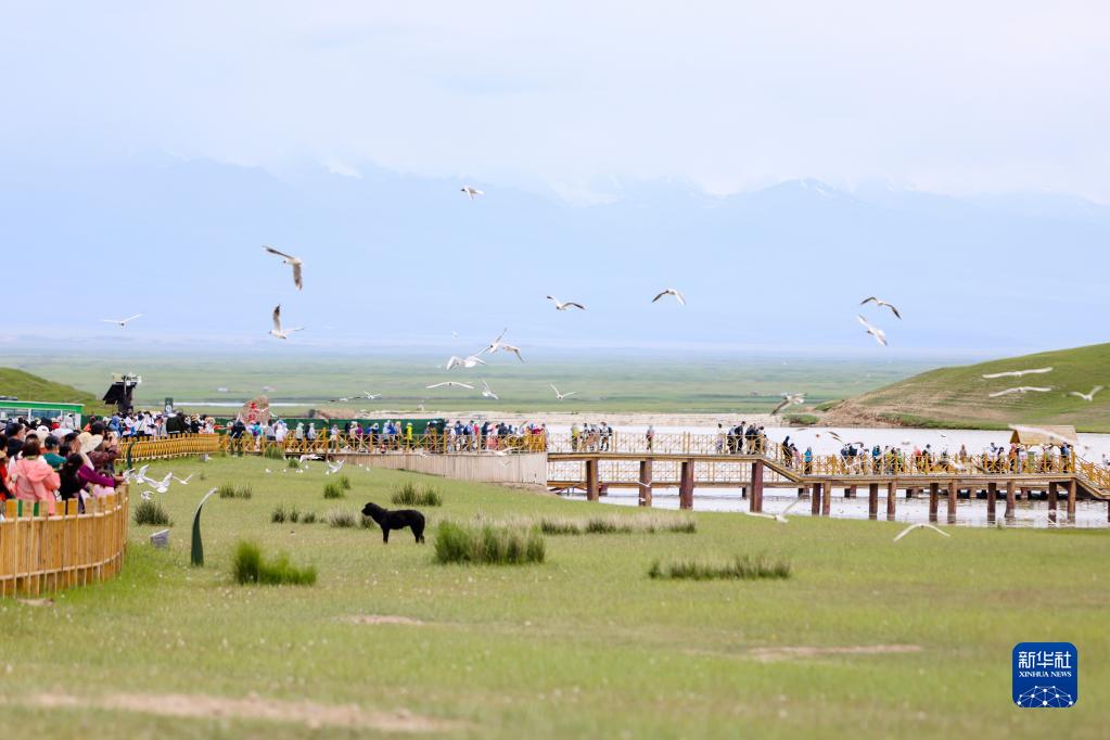 游客在巴音布魯克天鵝湖景區參觀(7月6日攝)。
