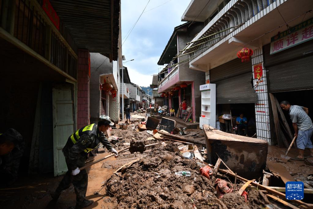7月2日,在湖南省湘西土家族苗族自治州古丈縣巖頭寨鎮草潭村,當地應急民兵協助村民清理淤泥和垃圾。