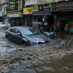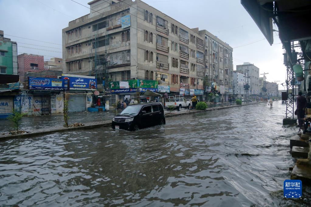 7月7日,車輛在巴基斯坦海得拉巴積水的道路上行進(jìn)。