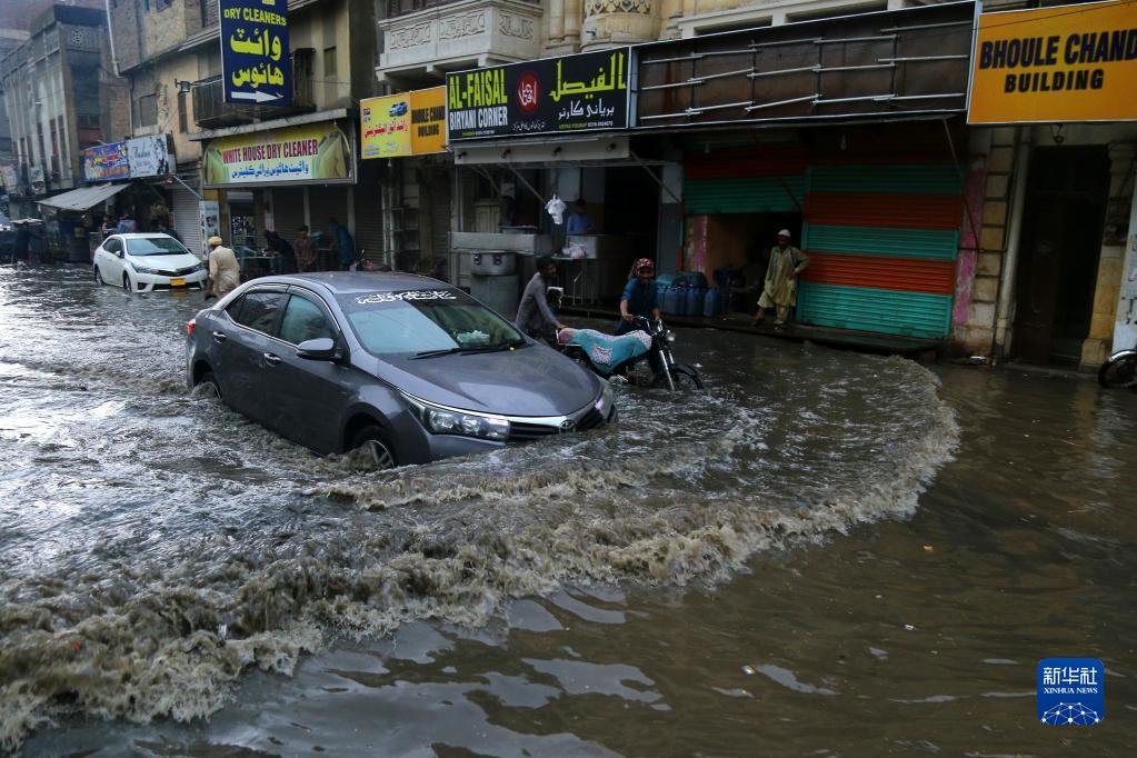 7月7日,車輛在巴基斯坦海得拉巴積水的道路上行進。