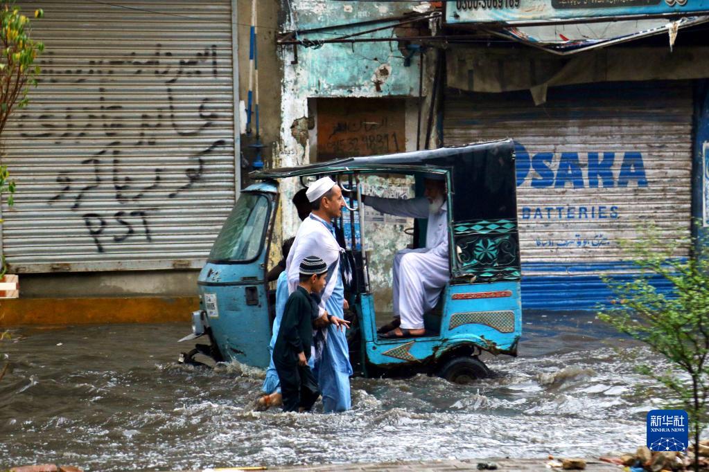 7月7日,人們在巴基斯坦海得拉巴積水的道路上行進。