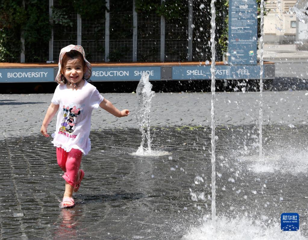 7月8日,一名女孩在德國法蘭克福的一處噴泉玩水。