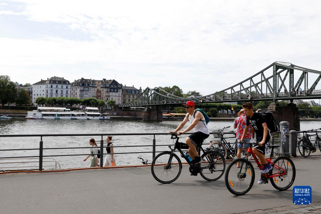 7月8日,人們騎車經過德國法蘭克福美因河畔。
