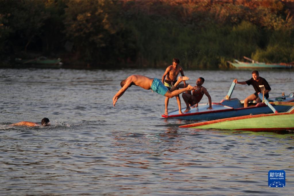 7月8日,在埃及蓋盧比尤省,人們?cè)谀崃_河里戲水避暑。