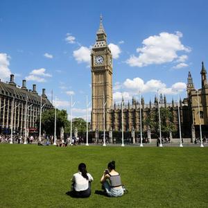 7月7日,兩名女子在英國(guó)倫敦大本鐘附近沐浴陽光。