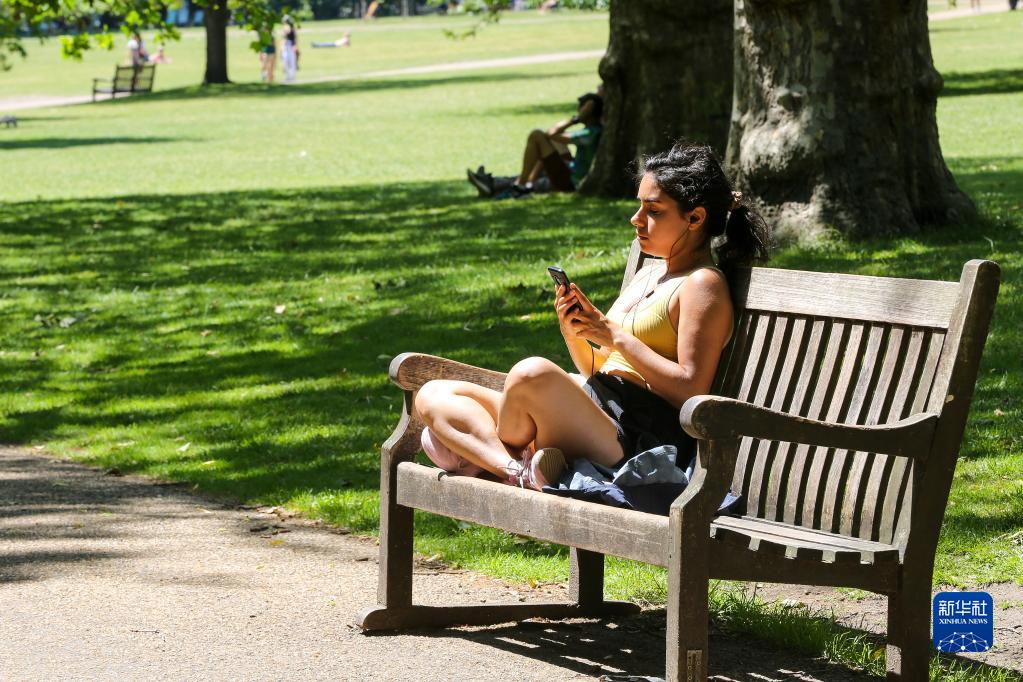 7月7日,一名女子在英國倫敦圣詹姆斯公園沐浴陽光。