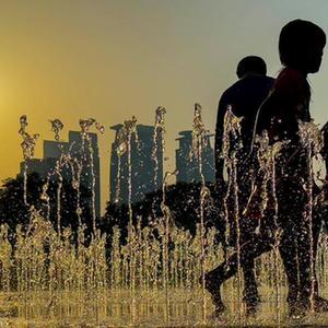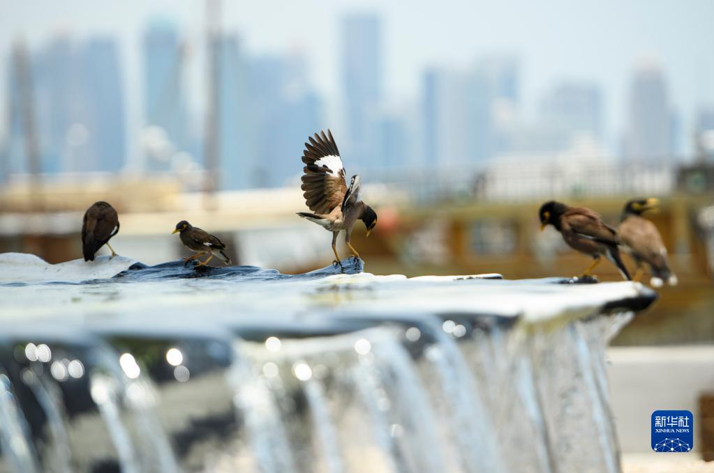 7月6日,在卡塔爾多哈,鳥群在噴泉處納涼。