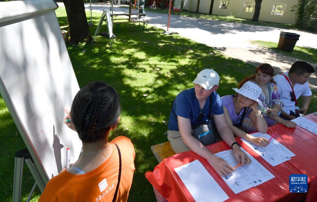 7月8日,在德國柏林世界公園,人們在中國展區學習中文。