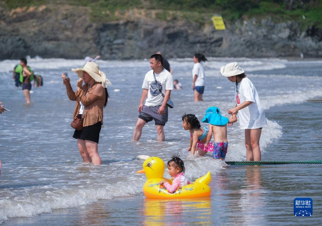 7月8日,游客們在朱家尖南沙景區的沙灘上戲水。