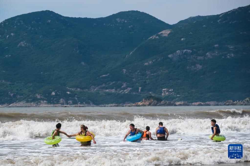 7月8日,游客在朱家尖南沙景區(qū)的沙灘上戲水。