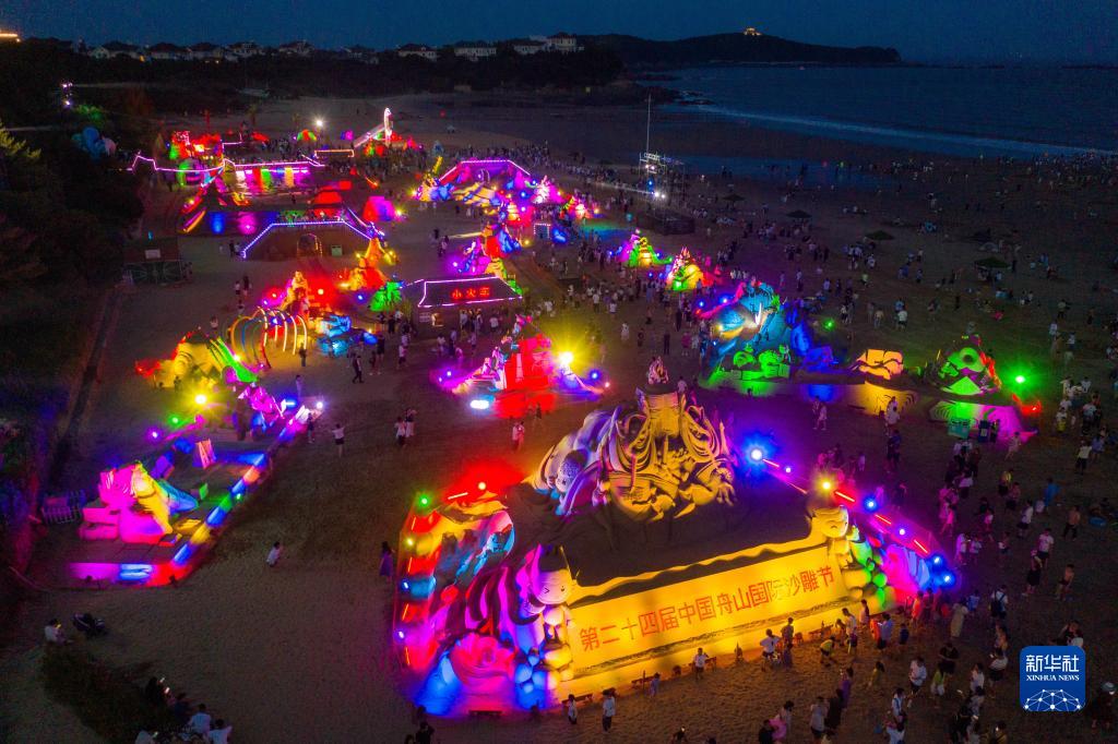 7月8日,這是朱家尖南沙景區(qū)燈光映照下的舟山國際沙雕節(jié)沙雕作品(無人機照片)。