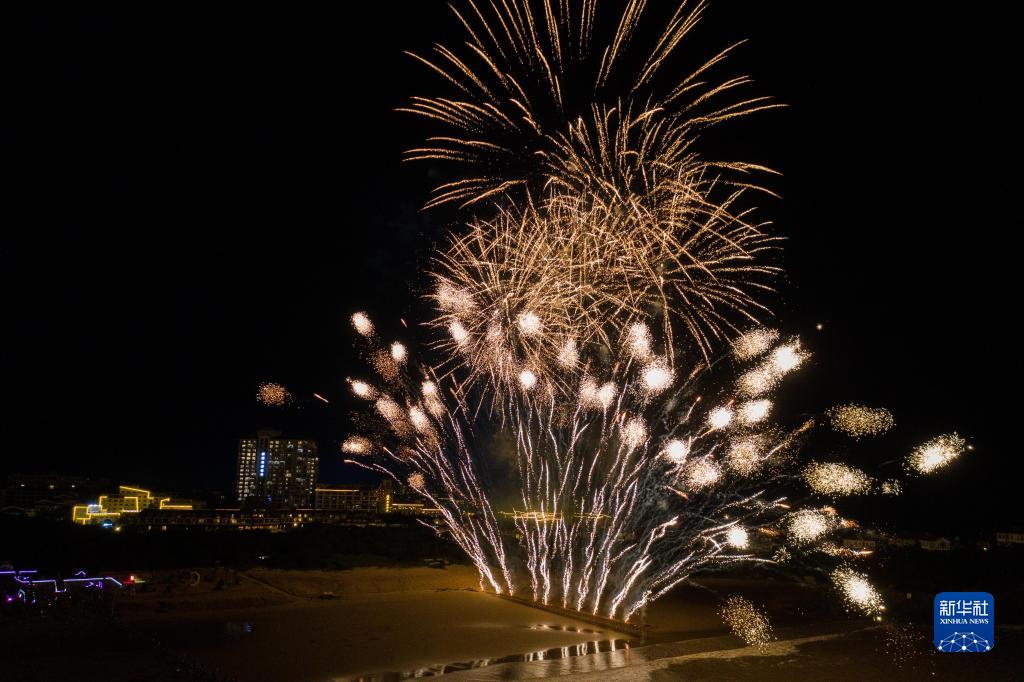 7月8日,朱家尖南沙景區舉行的沙灘煙花秀(無人機照片)。