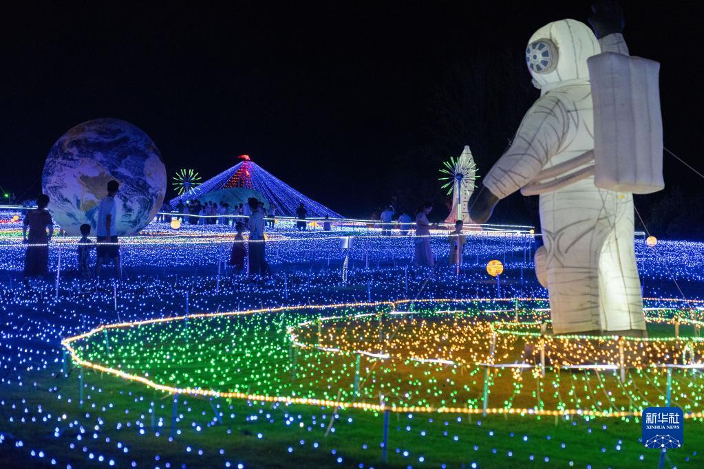 7月8日晚,安徽省合肥市肥東縣橋頭集鎮歡樂森林景區,人們在欣賞燈展。
